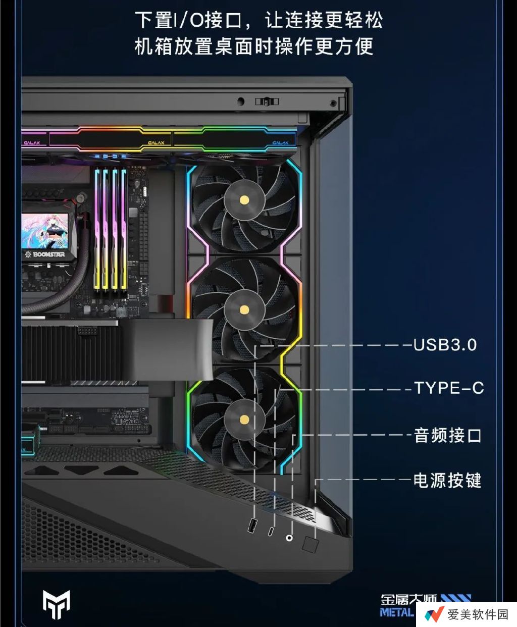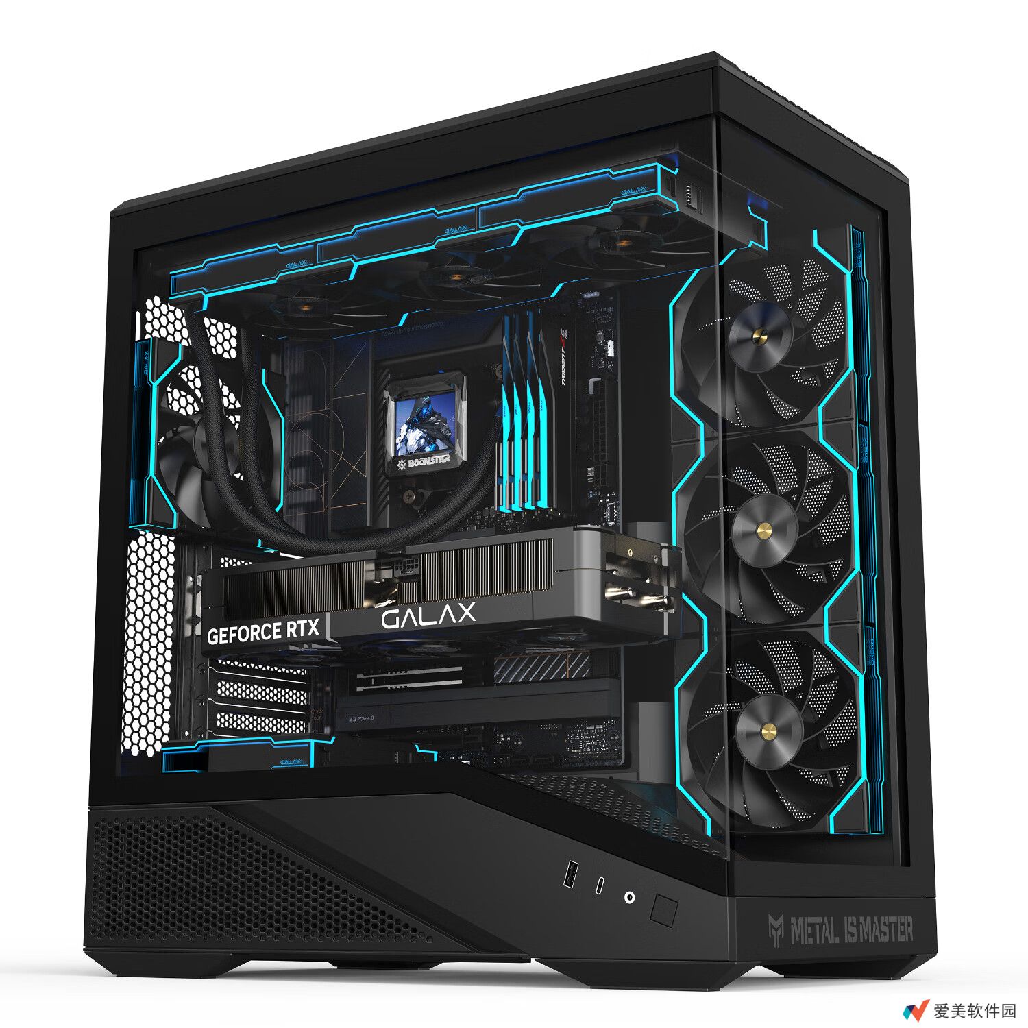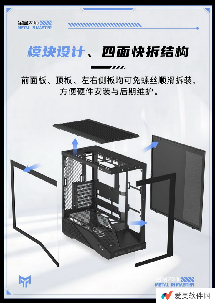 这款机箱延续了金属大师系列的几何线条语言设计,采用独特的斜边设计 +侧面大面积钢化玻璃侧透设计;配备了经过反复测试的风道系统,最多可配置 8 枚散热风扇。