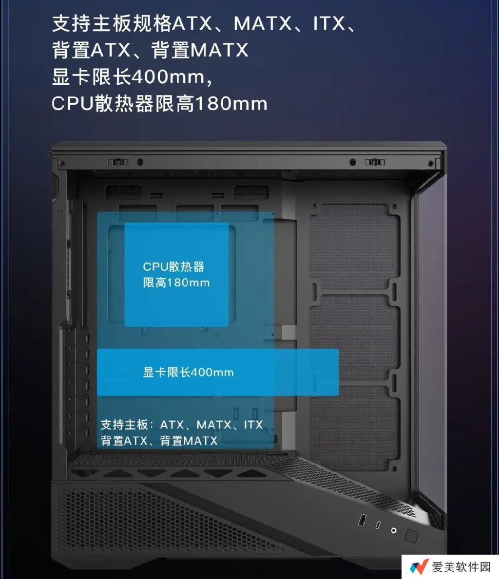 这款机箱能够兼容市面上主流规格的主板、显卡、电源等硬件,以及最新的 RTX 50 系显卡。同时,机箱内部预留了充足的走线空间,支持 ATX、MATX、ITX、背置 ATX、背置 MATX 主板。
