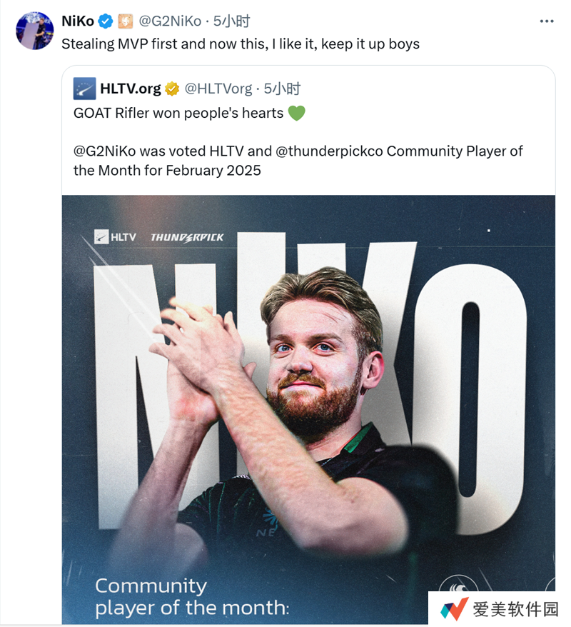 NiKo本人也转发推文并开玩笑说道:“先是偷走了MVP,现在又是这个,我喜欢,小伙子们继续保持。”