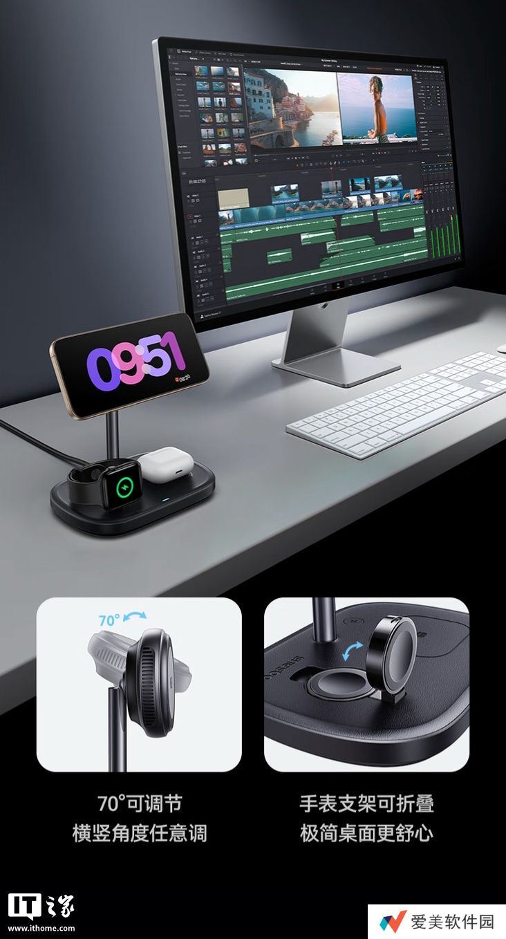 该充电器支持为 iPhone 15W Qi2 磁吸充电,充电器支架支持俯仰,手表支架可以折叠,方便携带。