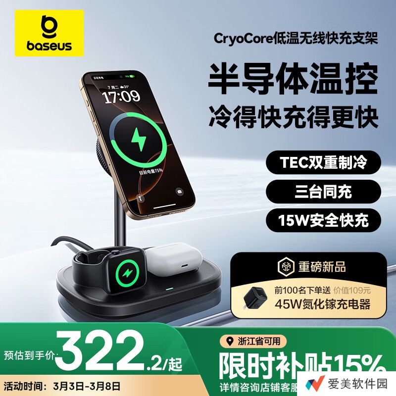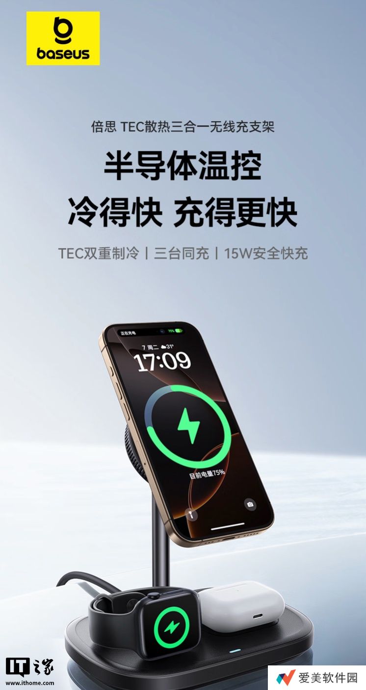 本站 3 月 4 日消息,倍思现已在京东上架一款 TEC 散热三合一磁吸无线充电器,支持手机手表耳机同充,首发价为341.1 元。