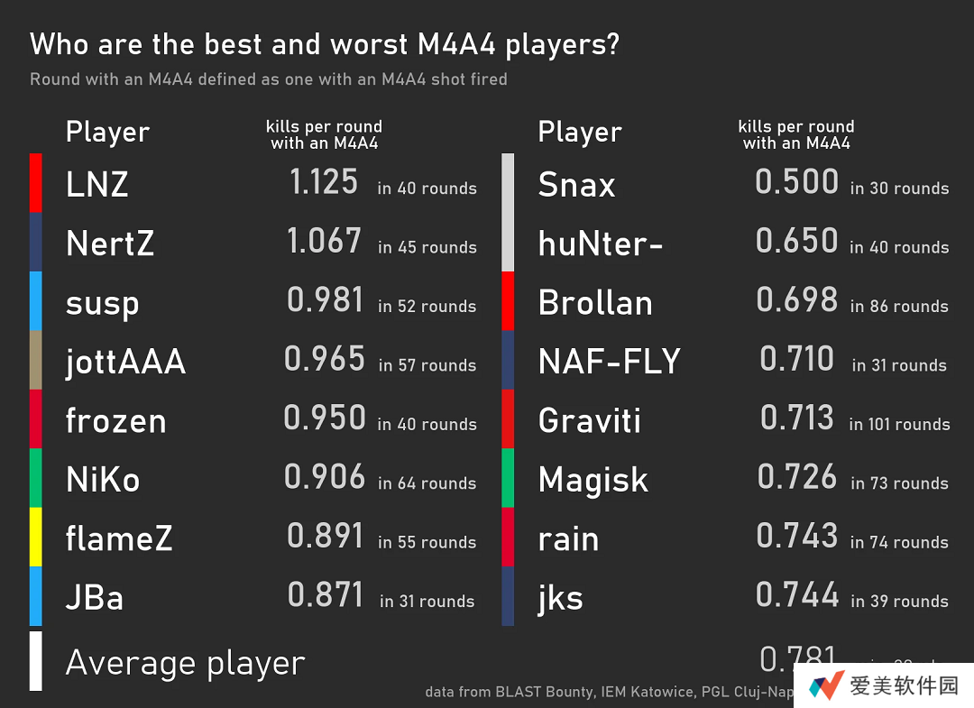 近日,有数据爱好者统计了今年到目前为止,BLAST 赏金赛S1、IEM 卡托维兹和PGL 克卢日-纳波卡三场国际大型赛事中,职业选手们使用M4A1-S和M4A4情况下的每回合击杀数据。