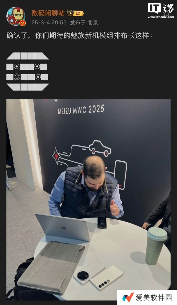 本站 3 月 4 日消息,博主 @数码闲聊站 今晚在微博上晒出一张新机图,在魅族今年 MWC 2025 的展会现场,一款“奥利奥”后置摄像模组的手机意外现身。他表示“你们期待的魅族新机模组排布长这样”,并以字符拼出一个八边形的三摄模组。