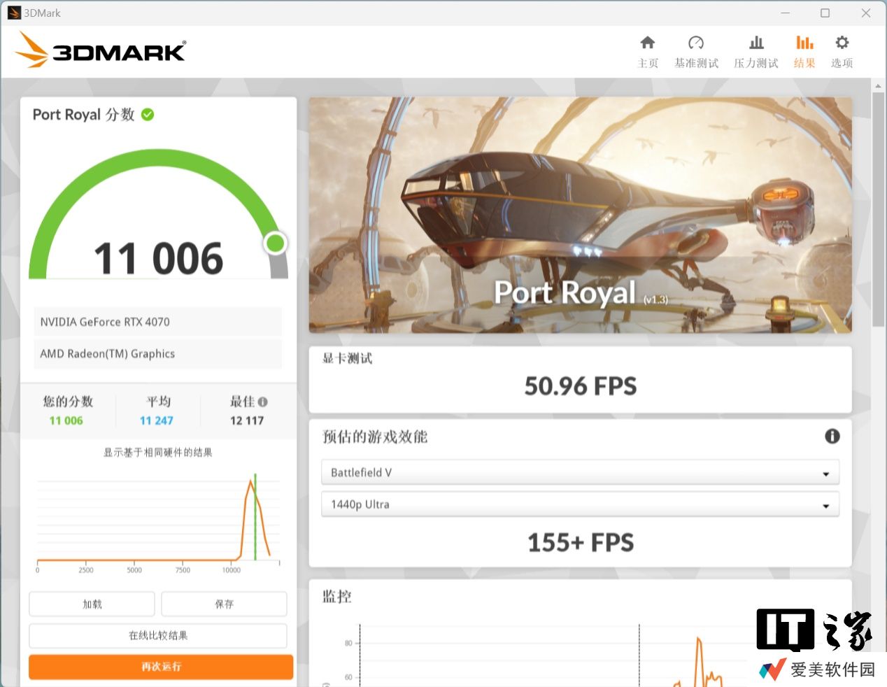 RTX 4070 显卡的 3 个场景分别拿到了 2554 分,1260 分、1325 分;