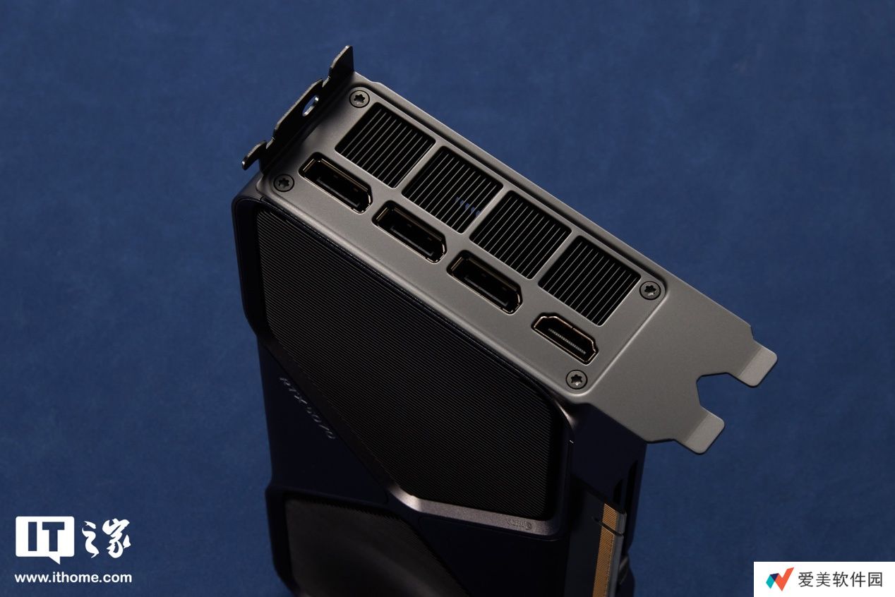 最左侧 I/O 接口的金属挡板上,配备了 3 个 DP2.1b 接口和 1 个 HDMI2.1b 接口,最高支持 8K / 165Hz 视频输出。接口下方对应四个方形散热开孔,排列非常规整。