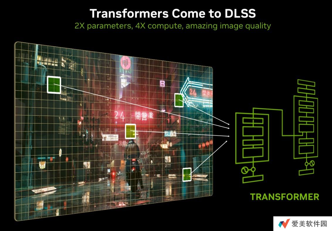 DLSS 4 技术还带来了模型架构的重大升级,DLSS 光线重建、DLSS 超分辨率和 DLAA 特性均由首个实时 Transformer 模型驱动,并用来提升生成像素的质量,它支持通过自注意力操作评估整个帧几多个帧中每个像素的重要程度,更好理解场景关系,让生成的像素具有更好稳定性、更少的伪影、更丰富的运动细节和平滑边缘。
