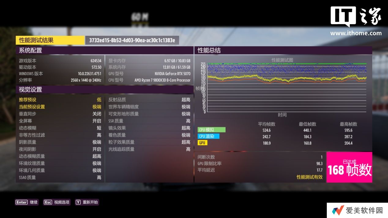 RTX 5070 在 2K 分辨率 + 极端画质下,游戏平均帧数为 168 帧,1% Low 帧 140 帧;