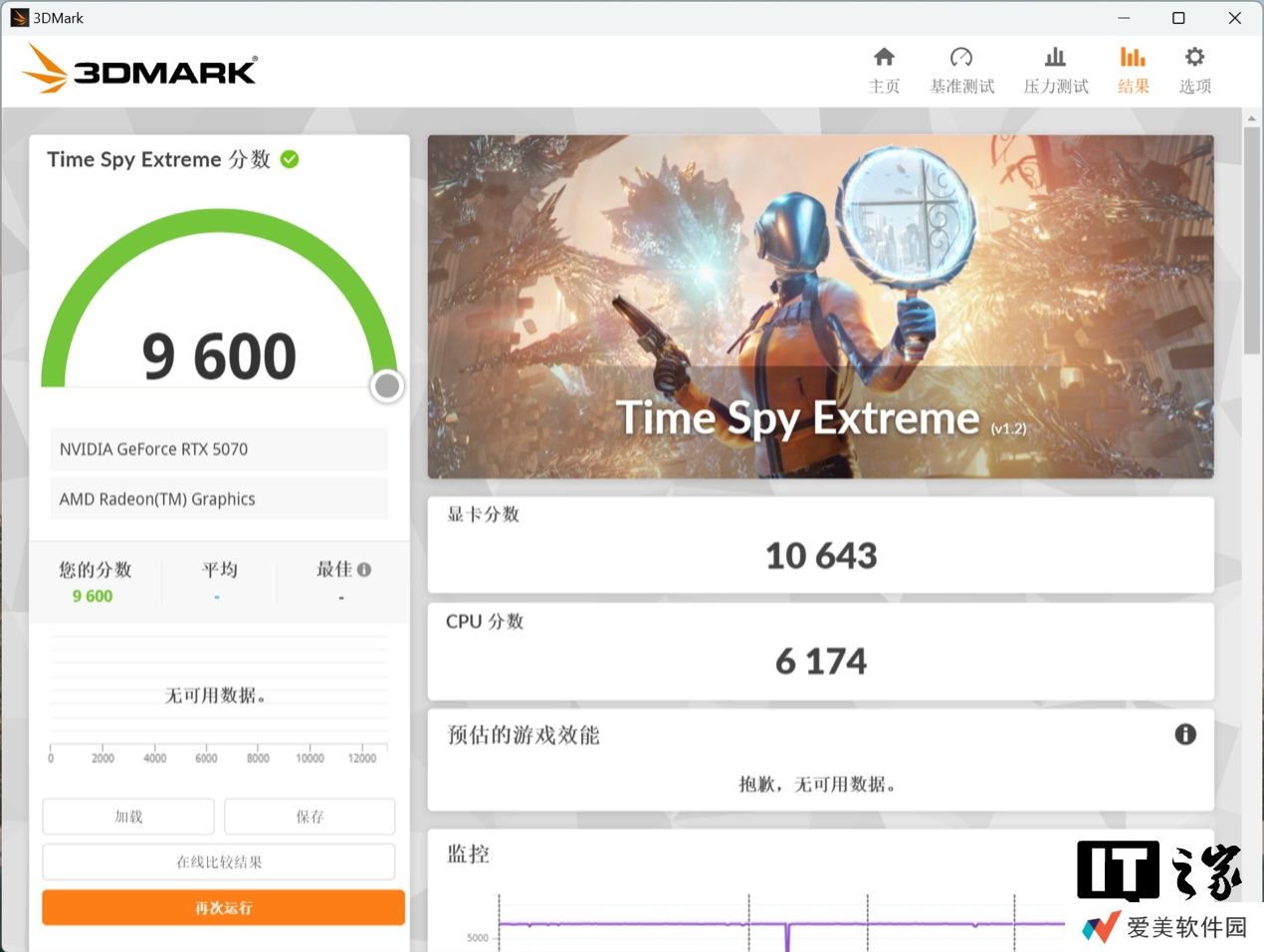 在 3D Mark Time Spy Extreme DX12 测试中,NVIDIA GeForce RTX 5070 显卡分达到了 10643 分,对比 NVIDIA GeForce RTX 4070 显卡的 8261 分,提升幅度约 28.8%。