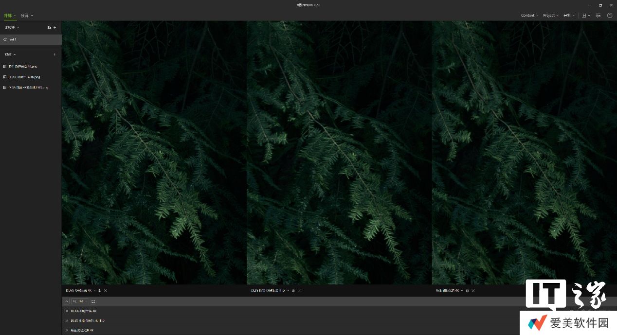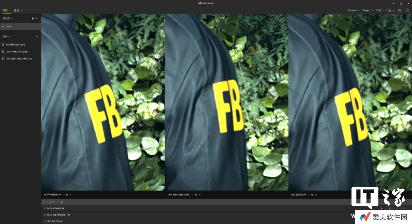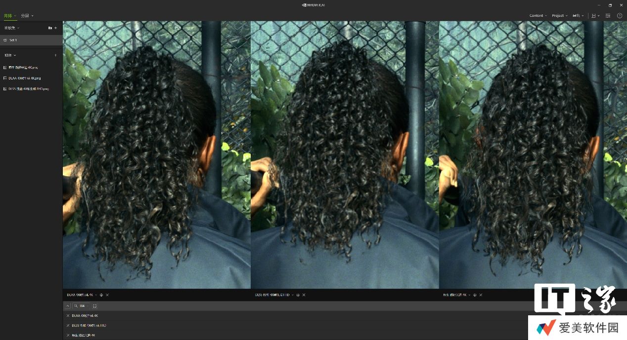 然后通过 NVIDIA ICAT 工具进行比较,在不放大的情况下 3 者根本看不出区别,所以我们挑选了 3 处细节进行放大对比。