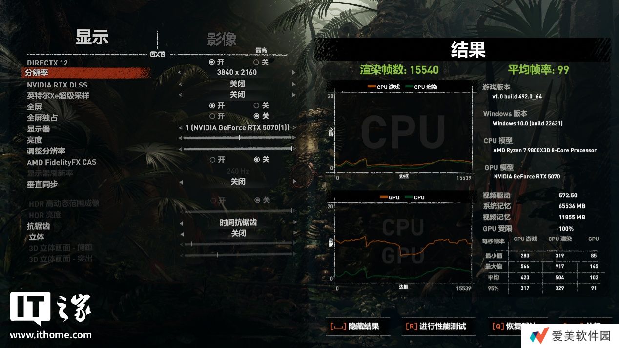 RTX 5070 在 4K 分辨率 + 最高画质下,游戏平均帧数为 99 帧,1% Low 帧 85 帧;