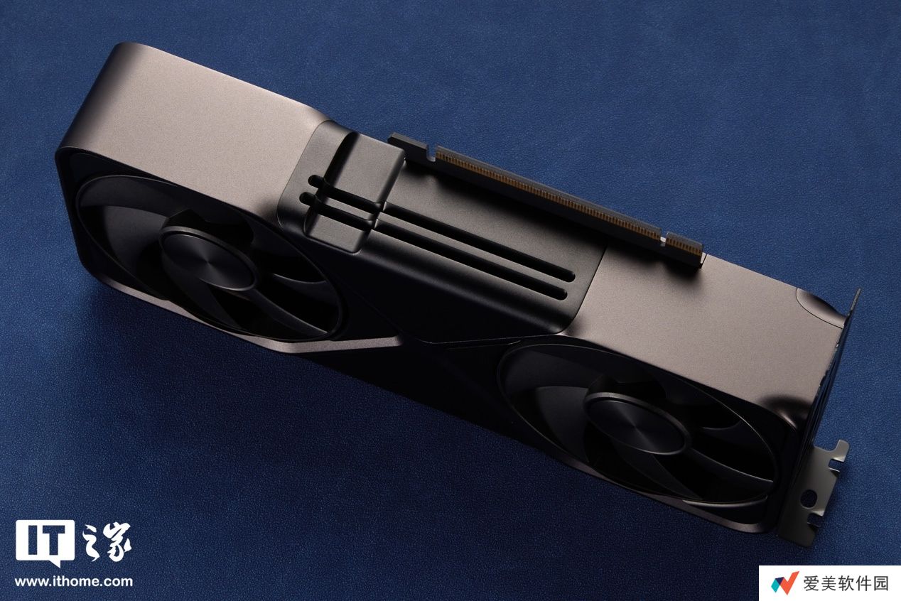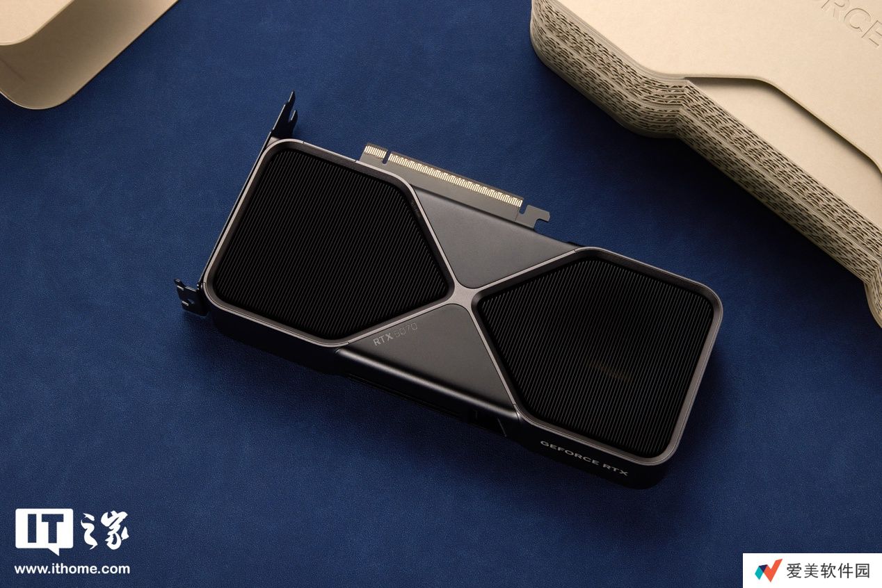 显卡另一面对应着双风扇的位置,布满了非常密集的竖向散热鳍片,便于散热。X 造型“沙漏”包边的中间三角形边缘部分做了圆润的弧形过渡,让握持的手感更加柔和。其中一个三角区域印着小小的 RTX 5070 标志。