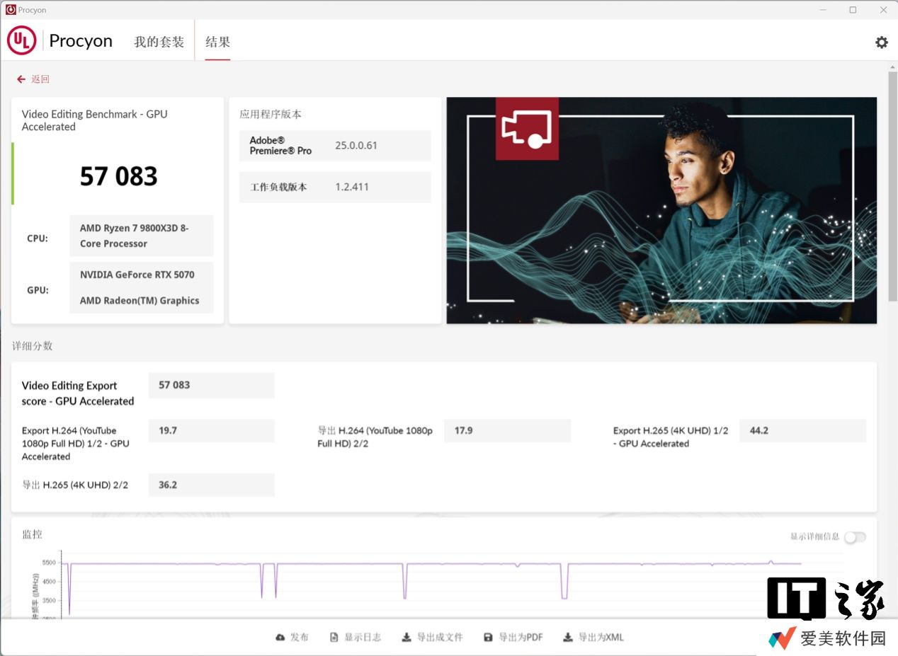 在 UL Procyon 的视频剪辑性能测试项目中,GPU 加速,得益于 Blackwell 架构升级的第九代 NVENC 编码器和 NVDEC 解码器,其在 H.264 / H.265 4:2:2 编码的 8 位和 10 位视频上有着非常大的优势,经过实测: