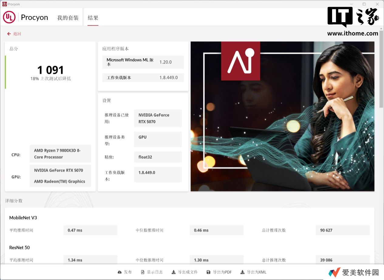在 UL Procyon AI 推理性能测试项目中的 Microsoft Windows ML 版本测试中: