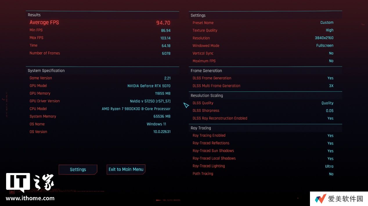 RTX 5070 在 4K 分辨率 + 最高画质 + DLSS 质量模式下,游戏平均帧数为 103 帧,1% Low 帧 77 帧,平均延迟 41ms;