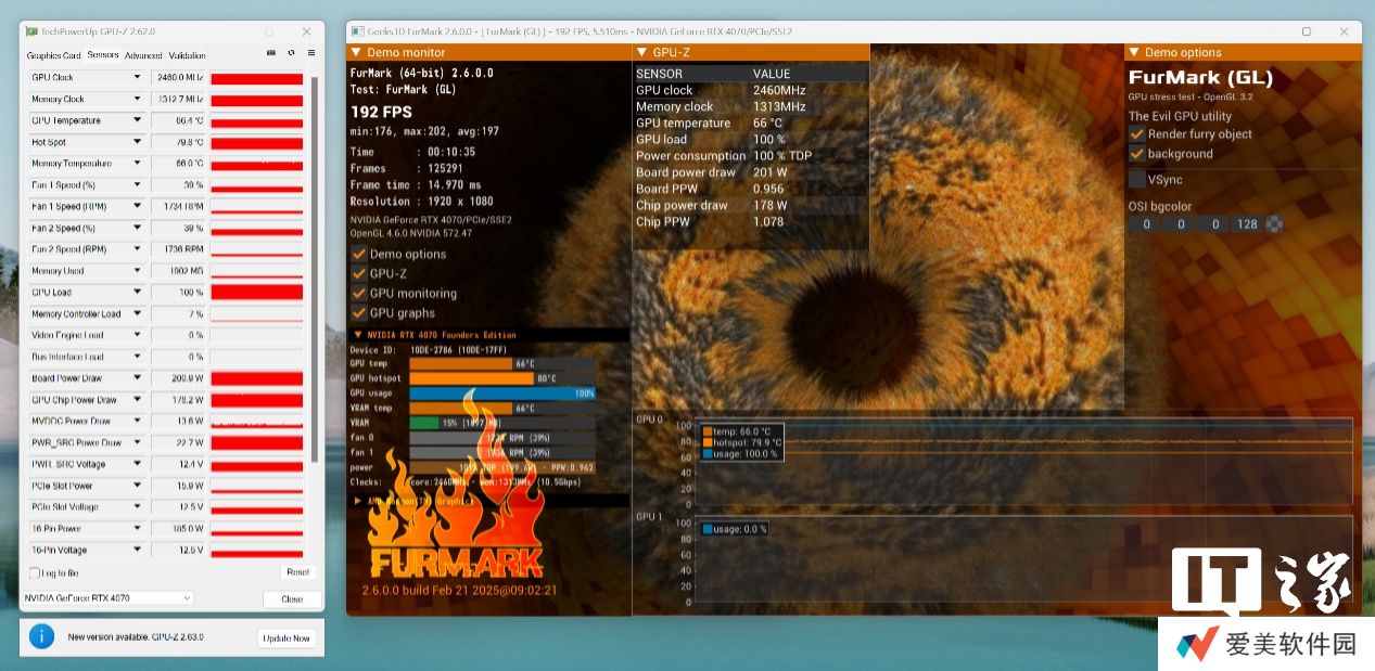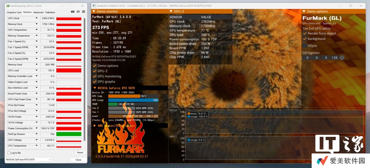 首先是烤机环节,NVIDIA GeForce RTX 5070 显卡在甜甜圈单烤 20 分钟后,GPU 功耗稳定在了 250W,GPU 主频比较保守只有 2385MHz,而 GPU 温度则是 76.7℃。对比 NVIDIA GeForce RTX 4070 的烤机表现来看,功耗和温度均有一定程度增加。不过考虑到 NVIDIA GeForce RTX 5070 显卡的整体尺寸缩小了不少,更加轻薄,温度略高一些,问题不大。