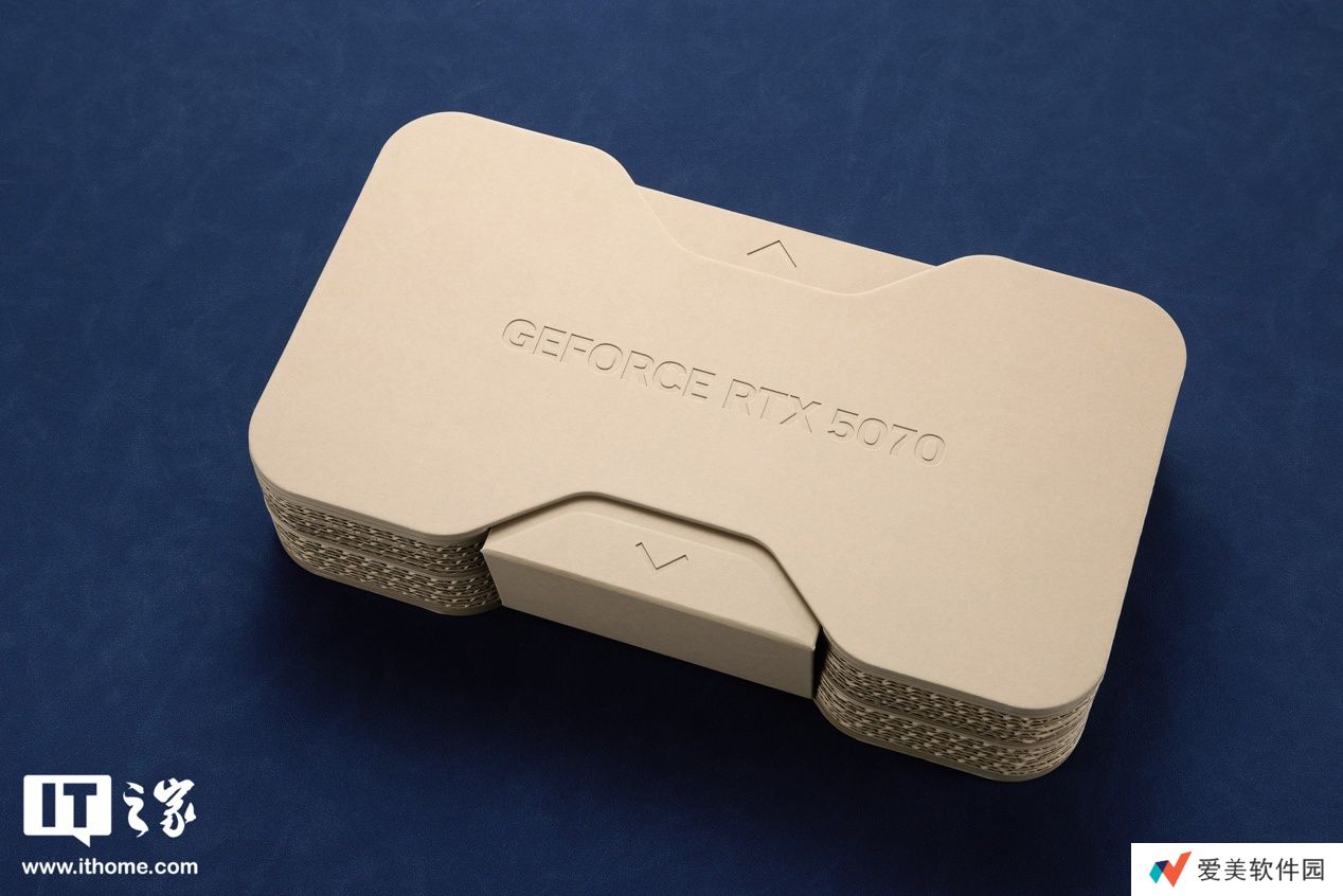NVIDIA GeForce RTX 5070 显卡采用了较为环保的原色纸箱包装,通过侧边抽拉式固定纸片进行密封,抽取方便且有仪式感。纸箱上印有 GeForce RTX 5070 的显卡型号,整体造型也暗示了显卡的对称美学设计风格。