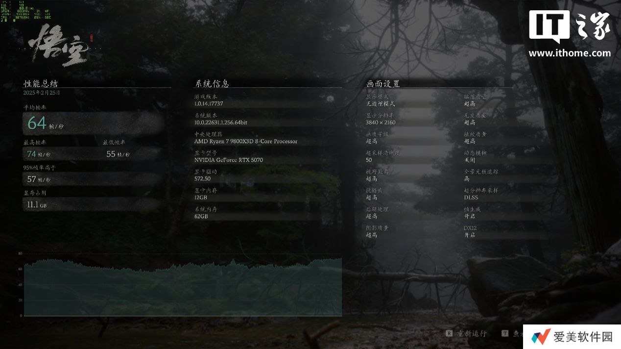 RTX 5070 在 4K 分辨率 + 超高画质 + 50% 超采样分辨率 + 高全景光追 + 帧生成下,游戏平均帧数为 64 帧,1% Low 帧 51 帧;