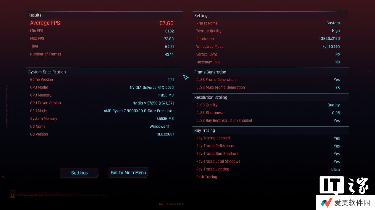 RTX 5070 在 4K 分辨率 + 极致画质 + 开启光追 + DLSS 抗锯齿下,游戏平均帧数为 81 帧,1% Low 帧 66 帧;