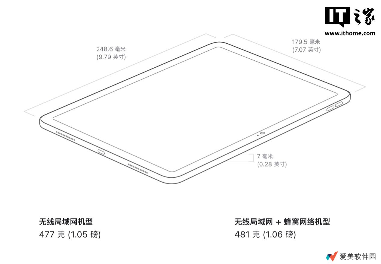 本站注意到,该机外观设计与iPad 10大致相同,机身可选银 / 蓝 / 粉 / 黄四种配色,仍采用集成指纹的顶部按钮(触控ID传感器),前置横向12MP摄像头,后置12MP摄像头,其中Wi-Fi版本477克,蜂窝版本481克。