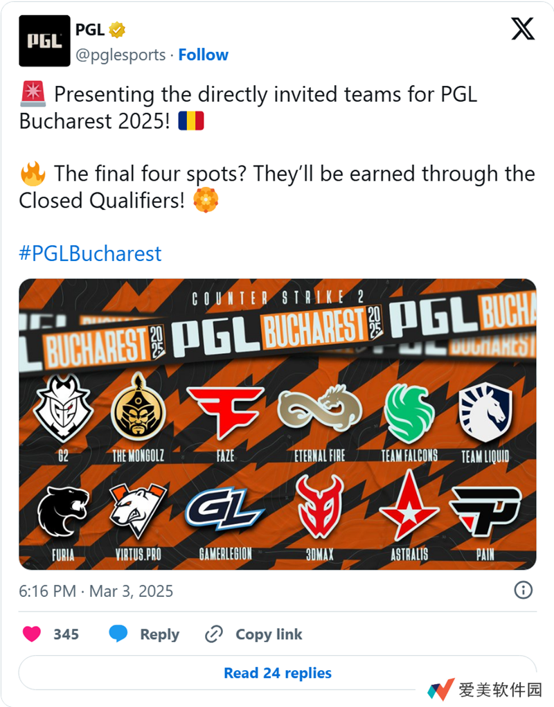 目前PGL布加勒斯特站的战队名单如下,还有四支战队将从地区预选赛中获得参赛资格: