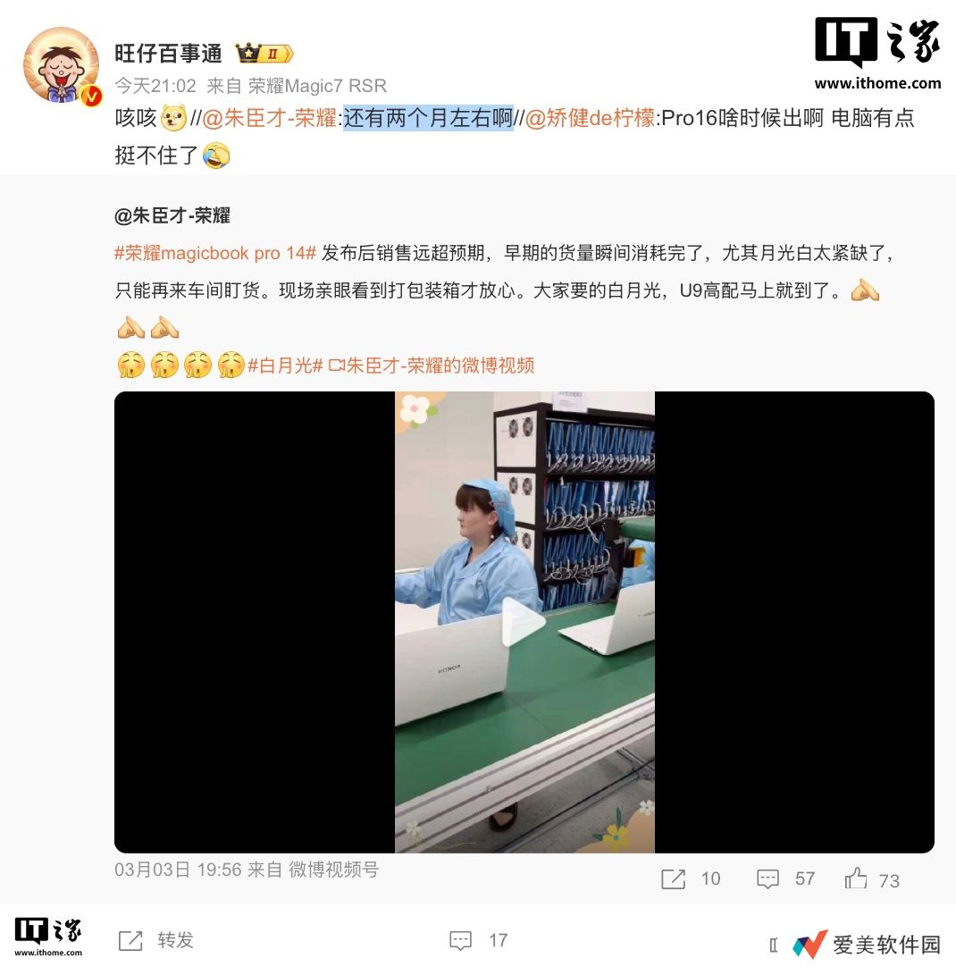 本站 3 月 4 日消息,荣耀PC产品线总经理@朱臣才-荣耀在微博回应网友称今年MagicBook Pro 16笔记本“还有两个月左右”。此前其还透露 MagicBook Pro 16 有望配备RTX 5070显卡。