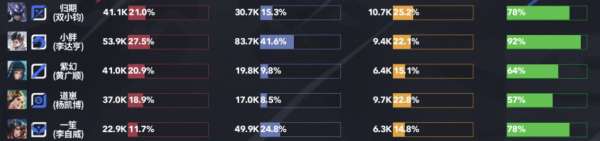G5元坦27.5%输出占比+41.6%承伤占比+92%参团率,三项数据全部队内第一。