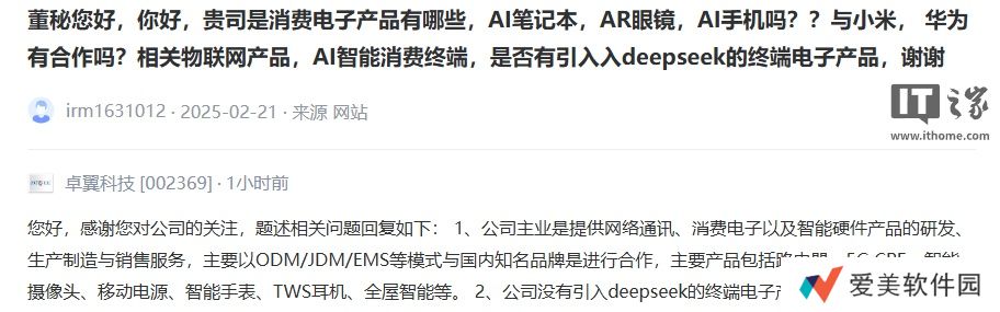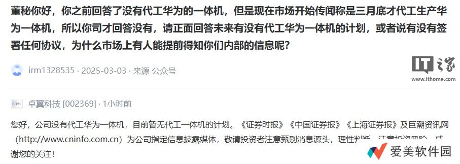 本站 3 月 6 日消息,深圳市卓翼科技股份有限公司今日在深交所互动易平台上回复投资者提问时表示:公司没有代工华为一体机,目前暂无代工一体机的计划。