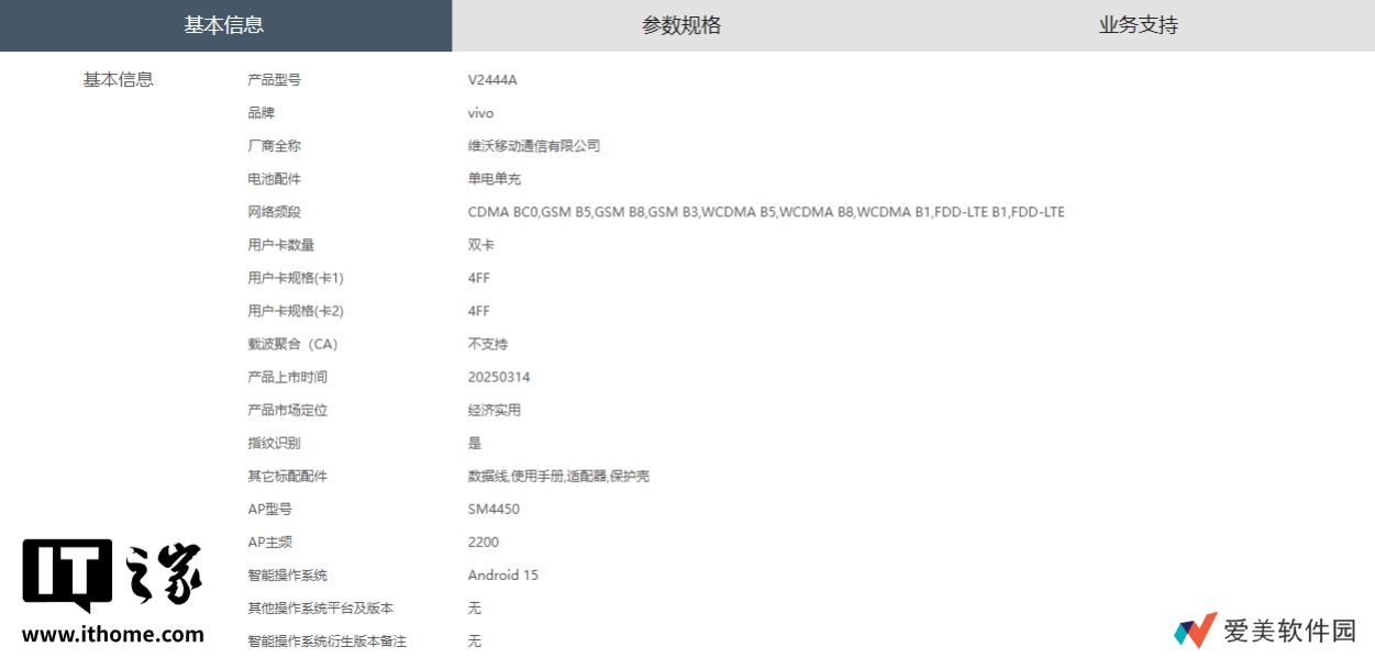 vivo Y300i 手机产品型号为 V2444A,市场定位“经济实用”,预装 Android 15 系统。新机尺寸为 165.70×76.30×8.09mm、重约 205g,分辨率 1608*720,内置 6500mAh 电池。