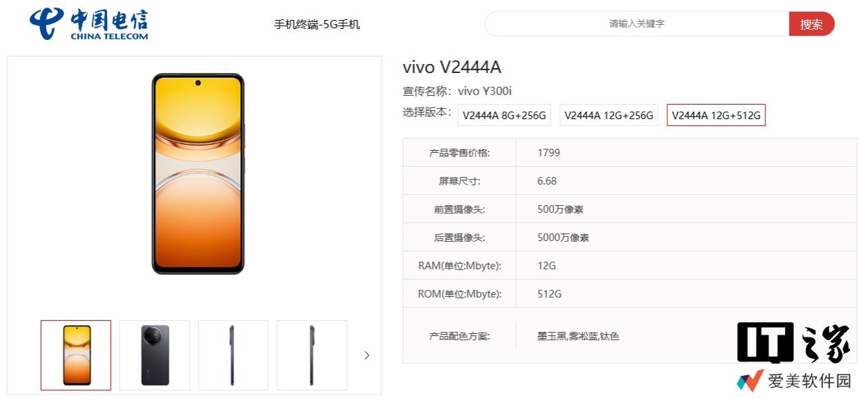 本站注意到,Y300i 手机已现身中国电信终端产品库,共 3 种规格版本,产品零售价 1499 元起。