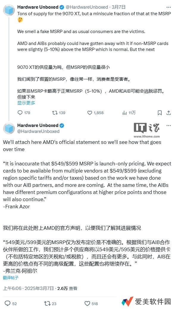 对此,AMD 向 Hardware Unboxed 回应称:MSRP 仅限首发阶段的说法并不准确,该公司将与各大板卡厂商及零售商保持合作,预计将继续在未来以 MSRP 提供该产品,并推出更多高端非公版显卡。