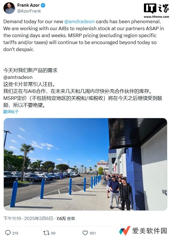 根据 AMD 游戏解决方案和游戏营销首席架构师 Frank Azor 本人的说法,该公司将继续与 AIB 板卡厂商保持合作,在未来一段时间内尽快为渠道零售商补充库存,并鼓励零售商继续维持 MSRP 销售。