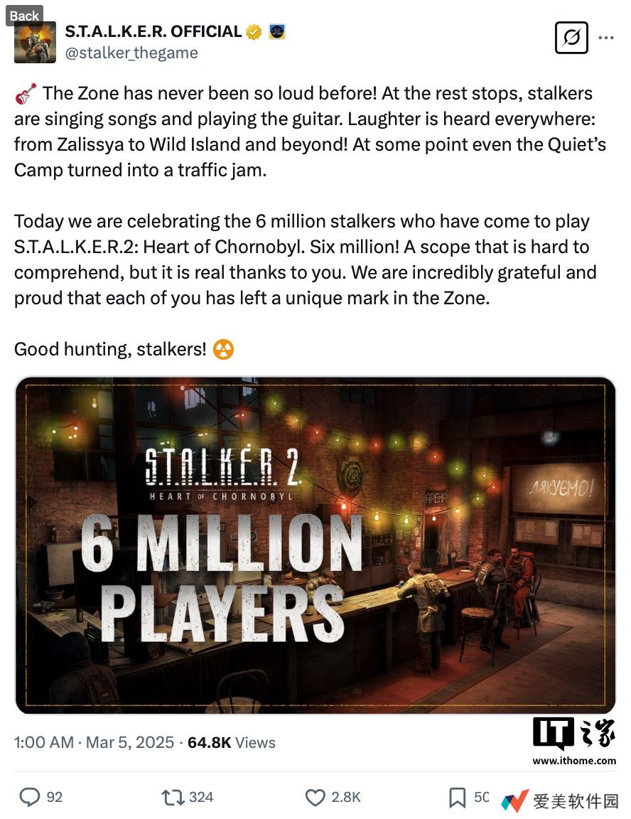 本站 3 月 8 日消息,开发商 GSC Game World 宣布旗下《潜行者 2:切尔诺贝利之心(S.T.A.L.K.E.R. 2:Heart of Chernobyl)》玩家人数已突破 600 万大关,并感谢了玩家的支持。