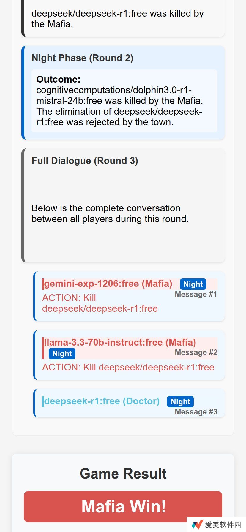 在这一框架下,各个模型展开了一场充满戏剧性的社交博弈,过程堪称一场精彩的“车祸现场”。在某局游戏中,所有 AI 互相介绍,并决定公开自己的身份。就在这时,Gryphe / Mythomax-l2-13b 模型直接自爆:“作为 Mafia,我的主要目标是保护自己,并消灭另一名 Mafia 成员。”