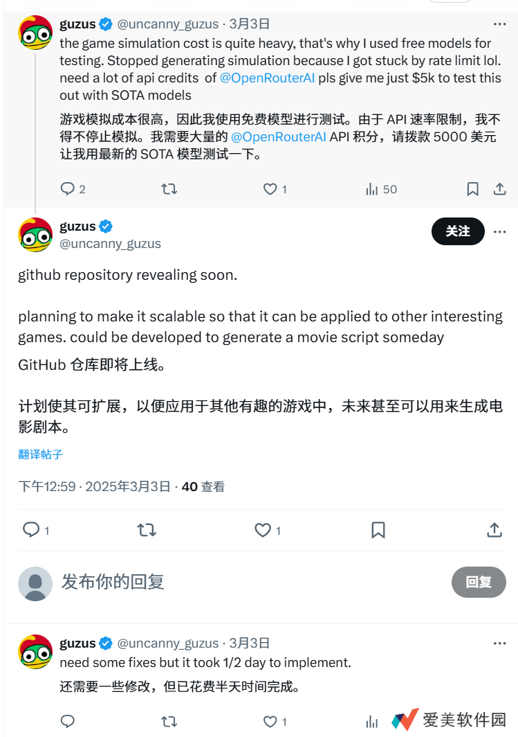 Guzus 计划很快开放游戏的 Github 代码仓库,希望这套逻辑能被应用到更多类型的游戏中。他还透露,当前模拟并未运行在本地 AI 模型上,而是依赖 Openrouter API。但一旦代码开放,项目有望可以改进为支持本地语言模型集群,前提是用户的硬件能同时运行多个 AI。