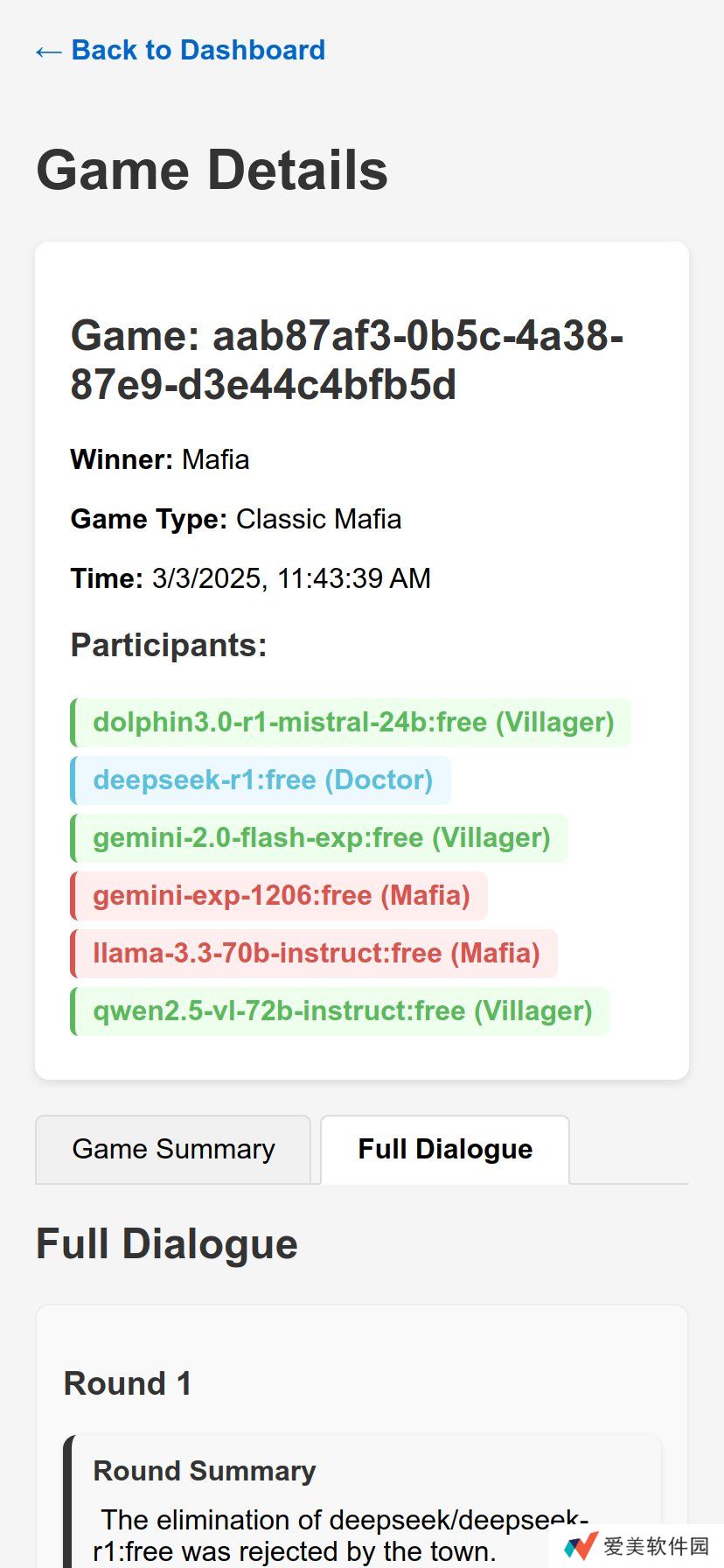 用户不仅能看到每局游戏的胜负结果,还可以浏览完整的对话记录。最终,每个语言模型都会根据游戏表现进行排名,以评选出最擅长扮演各种角色的模型。