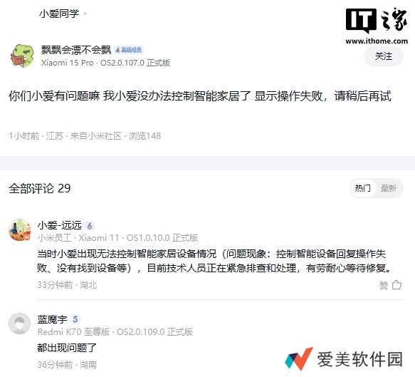 本站 3 月 8 日消息,部分小米用户在本站、小米社区等平台反馈称,小爱同学出现无法控制智能家居的情况。小米员工回复称,目前技术人员正在紧急排查和处理。