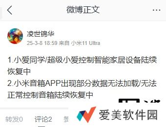 小米圈主 @凌世锦华 对此表示,目前小爱同学 / 超级小爱出现无法控制智能家居设备情况(回复操作失败),目前正在紧急排查处理;同时小米音箱 App 也出现了部分数据无法正常加载或无法控制音箱情况,目前正在排查处理,期间可以正常用语音控制音箱。