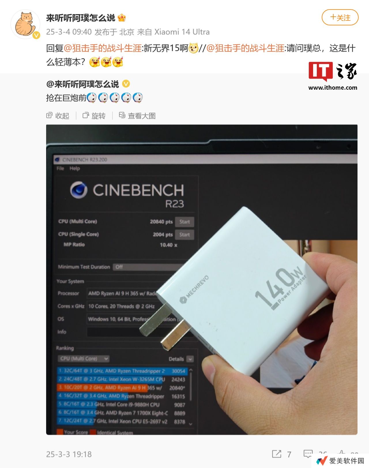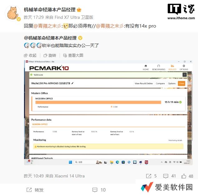 本站 3 月 8 日消息,机械革命轻薄本产品经理@来听听阿璞怎么说 昨日放出了一张关于“无界 15X Pro”的 PCMark 10 测试截图。他透露,机械革命未来还将推出无界 14X Pro。