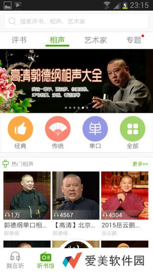 魔王听书是一款专门针对相声和评书的免费移动有声阅读软件,我们这里有海量高清音质的相声和评书,内容全面完整,是相声评书迷的首选听书利器;评书内容涵盖了著名评书表演艺术家单田芳、袁阔成、刘兰芳、田连元、连丽如、王玥波等大家的作品,新派评书海贼王、斗破苍穹、盗墓笔记魔王听书也进行了收录;相声内容全面收录了郭德纲、岳云鹏、马三立、刘宝瑞、侯宝林、马季、马志明、姜昆、曹云金、嘻哈包袱铺等著名相声大师、演员和团体的作品;魔王听书分为四大功能特色,分别为听书馆、我在听、演出和社区。