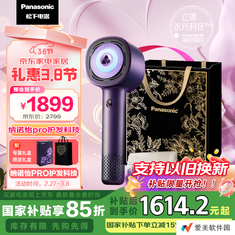 京东松下 家用高速纳米水离子吹风机 大功率速干电吹风 纳诺怡 Pro 水光离子花芯 MAX 国补后 1614.2 元直达链接