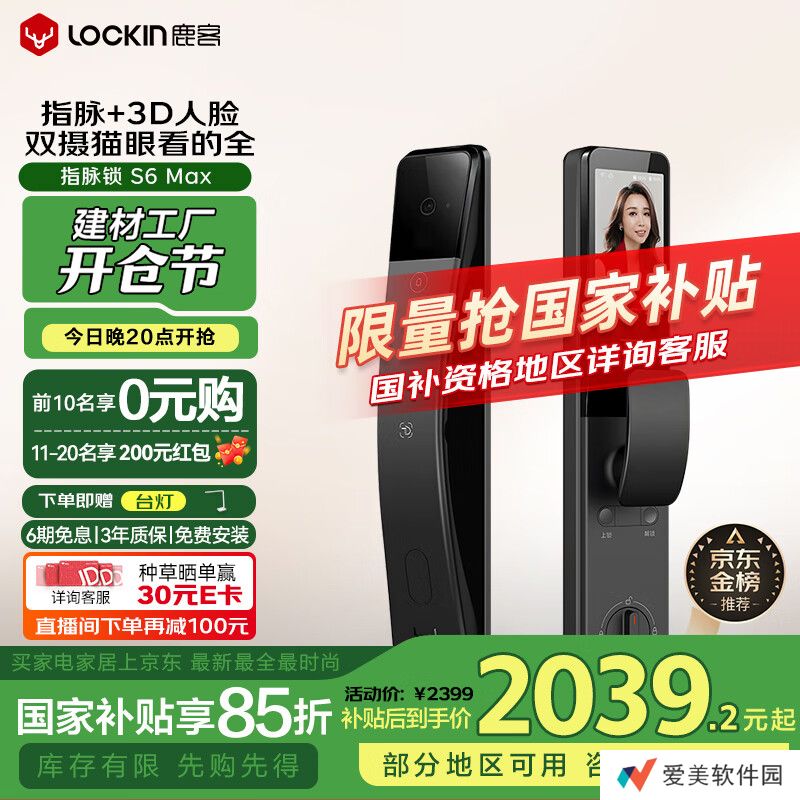 京东鹿客 指脉锁智能门锁 3D 人脸识别 双摄可视 大屏猫眼 S6 Max 国补后 2039 元领 120 元券