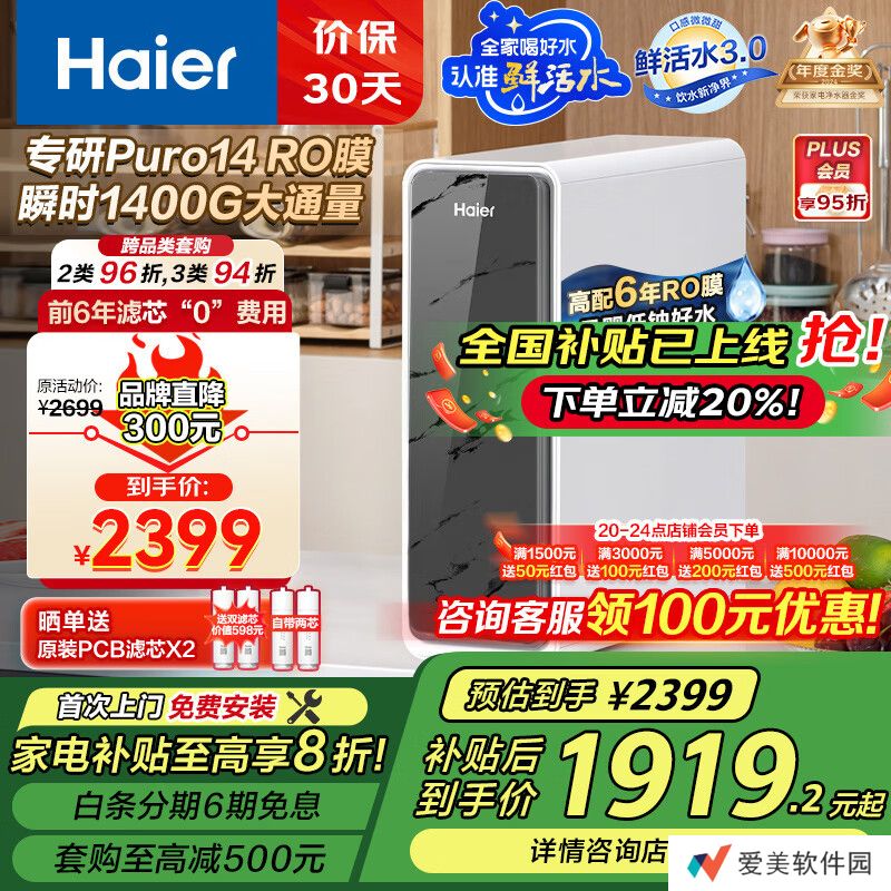 京东海尔 鲜活水家用净水机 1200G Pro 6 年 RO 净饮机 厨下直饮净水器 3.48L / 分国补后 1919 元领 60 元券