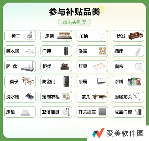 补贴品类包含:成品门窗、涂料、瓷砖、石材、木质地板、板材、吊顶、龙骨、灯具、卫浴洁具、洗水槽、门锁、开关、窗帘、床架、床垫、沙发、茶几、桌子、椅子、柜类、晾衣架、窗帘等部分。京东自营和指定店铺商品。