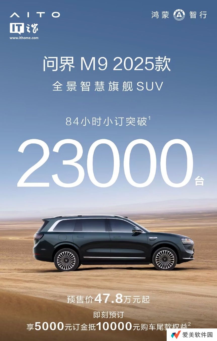 本站 3 月 9 日消息,据鸿蒙智行今晚公布的最新数据,旗下“家庭智慧旗舰SUV”问界M8 车型84小时小订突破4.7万台、“全景智慧旗舰SUV”问界M9车型 84小时小订突破2.3万台。