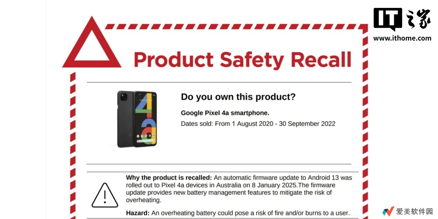 本站 3 月 10 日消息,3 月 7 日澳大利亚竞争与消费者委员会(ACCC)的产品安全监管机构发布了一份“项目安全召回”通知,确认谷歌 Pixel 4a 手机的电池性能更新是为了“降低电池过热的风险”。此前谷歌在 1 月宣布 Pixel 4a 电池性能计划时,并未明确说明发布该更新的具体原因,而此次澳大利亚的召回通知揭示了这一更新背后的真正目的。