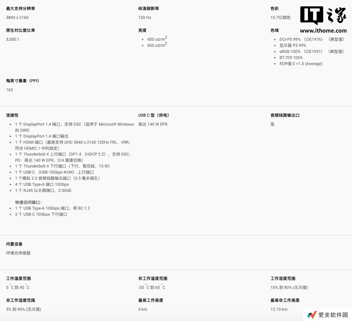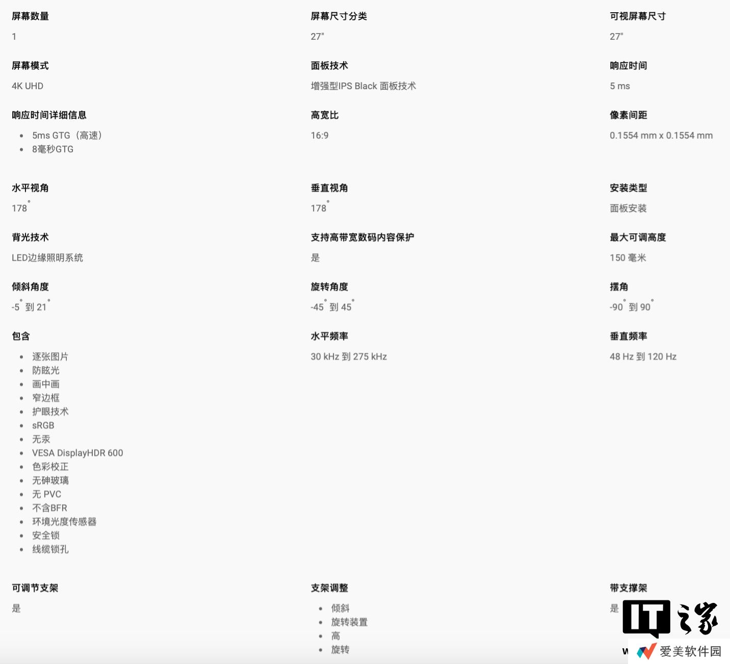 这款显示器配备3840x2160分辨率120Hz IPS Black面板,标准对比度3000:1,典型亮度450尼特,HDR峰值亮度600尼特,GtG响应速度5ms,支持 10-Bit 色彩,覆盖 99% DCI-P3 色域。