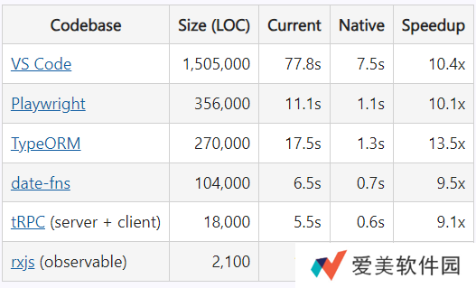 微软官方测试显示,本地实现已经能够加载许多流行的 TypeScript 项目,包括 TypeScript 编译器本身。以下是在 GitHub 上一些不同大小的流行代码库上运行tsc的时间: