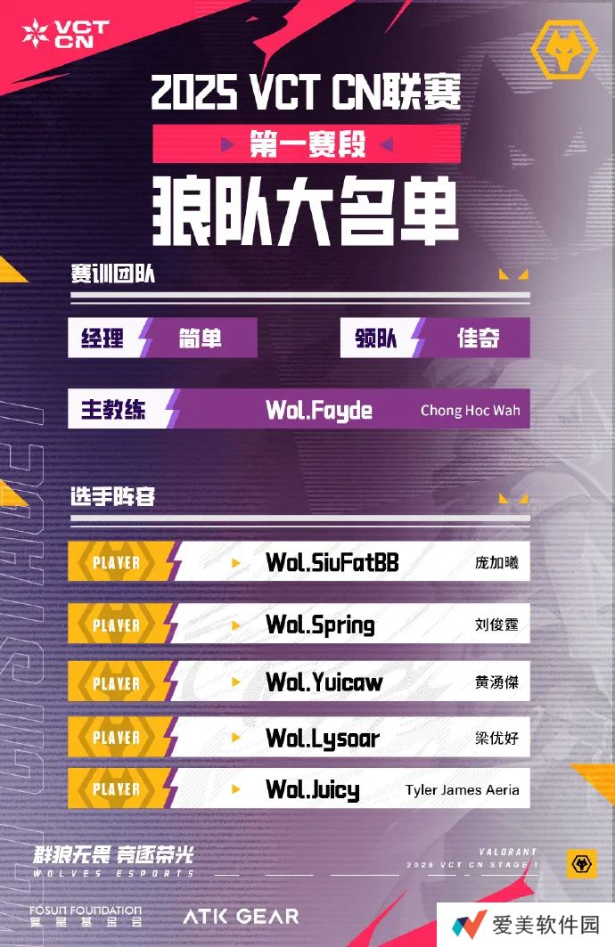 狼队公布2025 VCT CN第一赛段大名单:花开有信,春日可期。赛训团队经理:简单领队:佳奇主教练:Fayde(Chong Hoc Wah)选手阵容SiuFatBB(庞加曦)Spring(刘俊霆)Y