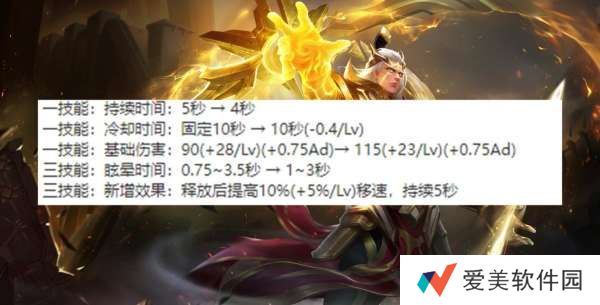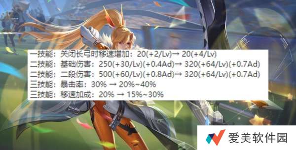 被动伤害后期提升,一技能前期冷却缩减提高后期不变,二技能前期冷却缩减降低,后期不变,二技能伤害前期降低,后期提高。这个调整就是后期伤害提高,刚好对应装备对于射手后期伤害的削弱。