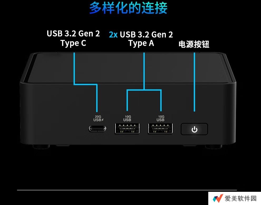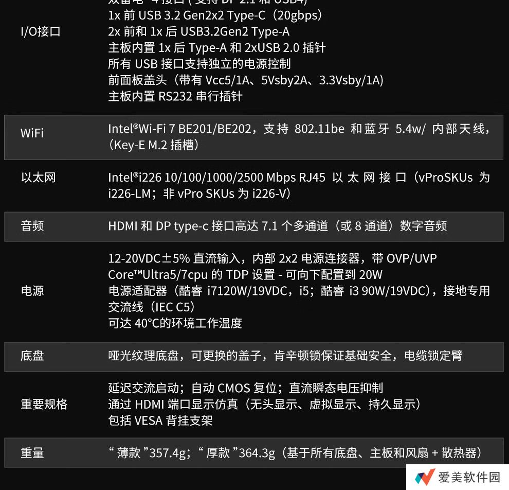 这款小主机仅有约 0.7L 的体积,采用快拆升级 2.0,采用双热管散热,可提供 64W 性能释放;支持电源同步(同步显示器和 NUC 主机的电源键)。